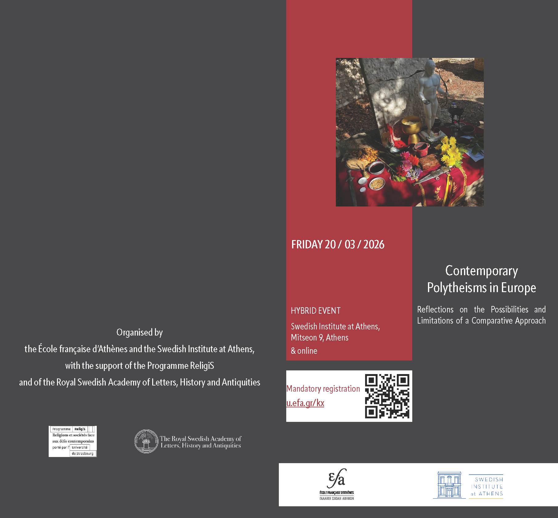 La journée se déroulera en format hybride (présentiel et en ligne), et l’inscription préalable est requise via le site de l’École française d’Athènes : https://www.efa.gr/events/contemporary-polytheisms-in-europe/