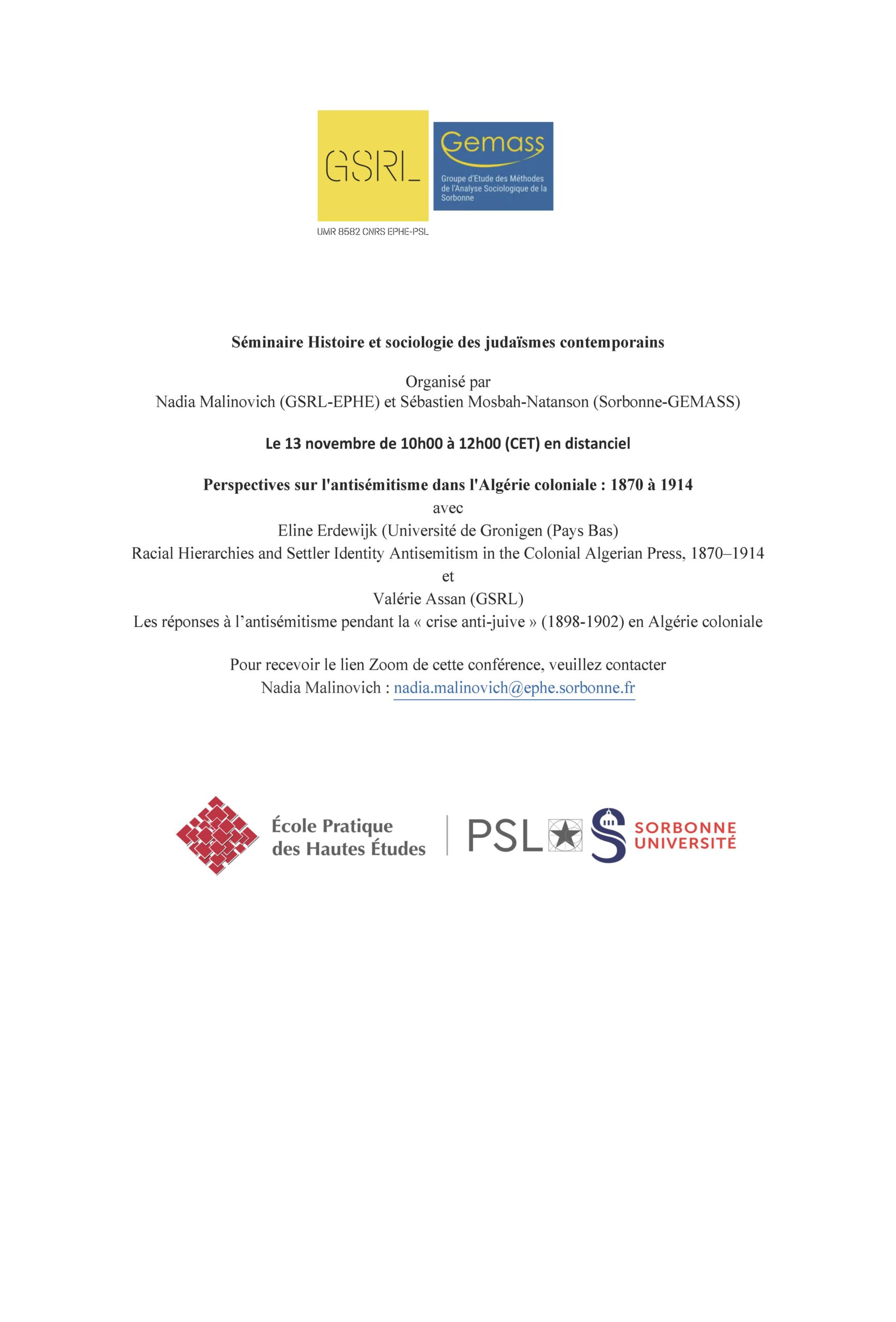 Séminaire Histoire et sociologie des judaïsmes contemporains : « Perspectives sur l’antisémitisme dans l’Algérie coloniale : 1870 à 1914 »
