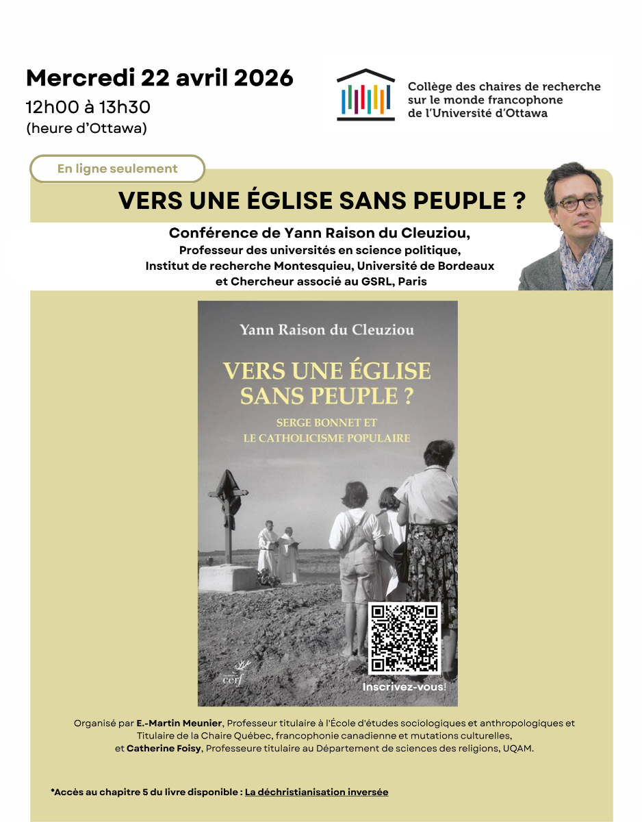Lien d'inscription : https://uottawa-ca.zoom.us/meeting/register/UNmFQPDyTP2wmii03mIlCg#/registration Chapitre de l'ouvrage disponible en libre accès : https://uottawa-my.sharepoint.com/personal/jmoukarz_uottawa_ca/_layouts/15/onedrive.aspx?id=%2Fpersonal%2Fjmoukarz%5Fuottawa%5Fca%2FDocuments%2FDechristianisationVersuneEglisesanspeuple%20YRC%2Epdf&parent=%2Fpersonal%2Fjmoukarz%5Fuottawa%5Fca%2FDocuments&ga=1